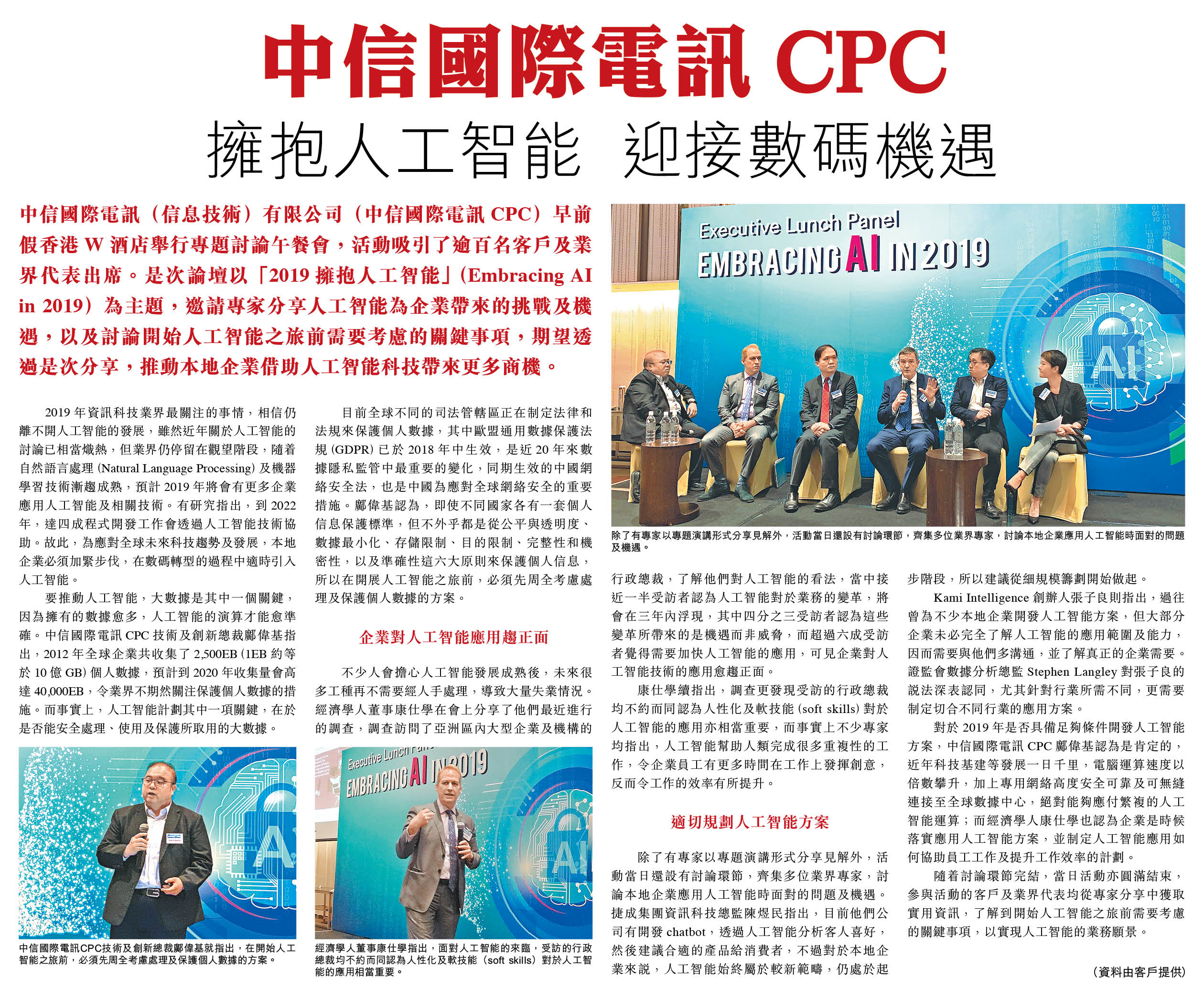 中信國際電訊(信息技術)有限公司(中信國際電訊CPC)早前假香港W酒店舉行專題討論午餐會,活動吸引了逾百名客戶及業界代表出席。是次論壇以「2019擁抱人工智能」(Embracing AI in 2019)為主題,邀請專家分享人工智能為企業帶來的挑戰及機遇,以及討論開始人工智能之旅前需要考慮的關鍵事項,期望透過是次分享,推動本地企業借助人工智能科技帶來更多商機。
